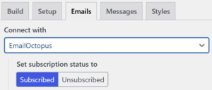Step 3: Go to your Happyforms Contact Form > Emails > Connect with Email Octopus. Additionally, you can indicate if the user will be subscribed or not. Remember to click “Update.”