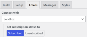 Step 5: In the Happyforms Contact Form, go to Emails > Connect with SendFox. You can also specify if the user will be subscribed or not. Remember to hit “Update.”
